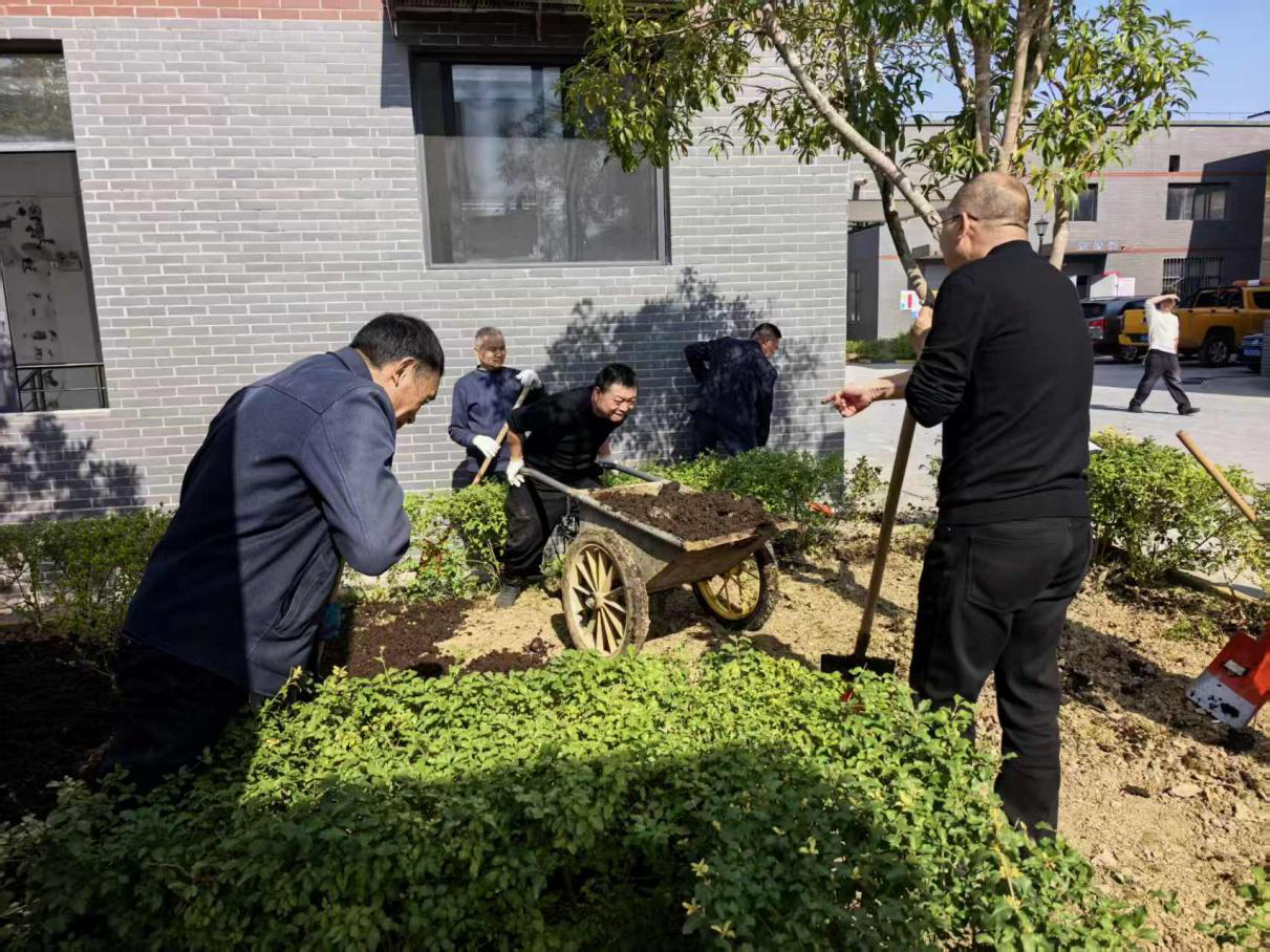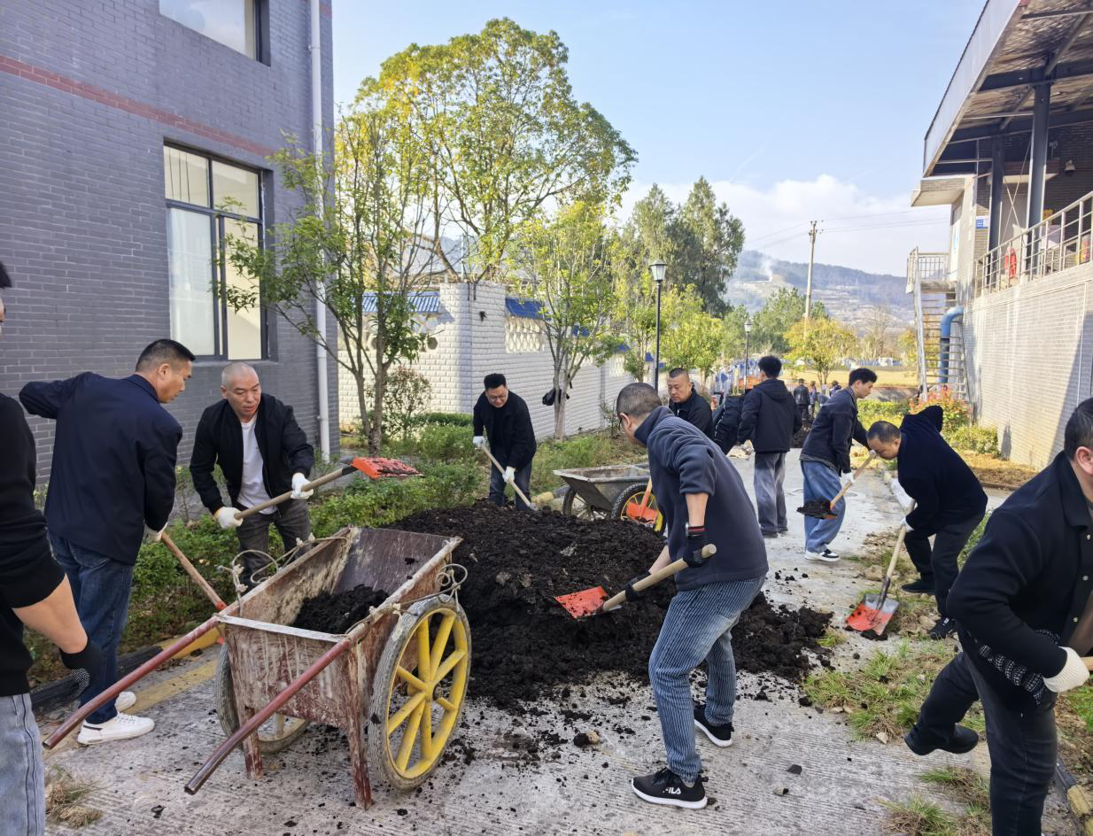 植树现场,全体人员根据党小组划分为三个作业小组。党员先锋带头示范,对驮山水厂原有枯死、生长不均的草坪区域进行松土、除石、平整,现场分工协作,配合默契,呈现出一派热火朝天的劳动场景,有效提升了党支部凝聚力和战斗力